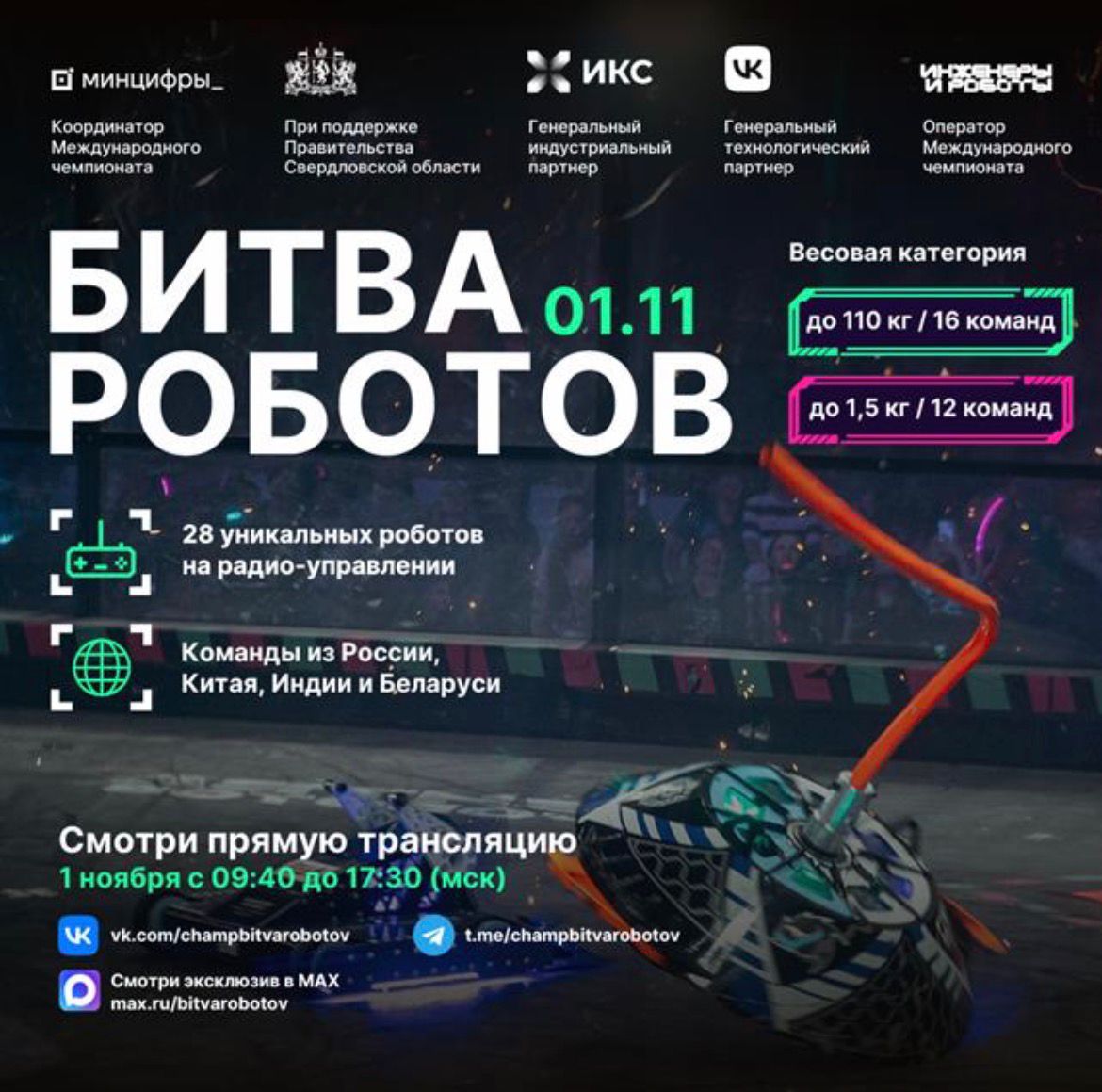 Минцифры России в соответствии с распоряжением Правительства Российской Федерации от 11 апреля 2023 г. № 889-р сообщает о проведении четвертого отборочного этапа Международного чемпионата по битве роботов сезона 2025 года (далее - Чемпионат, мероприятие). Цель Чемпионата - популяризация в Российской Федерации инженерной мысли как драйвера развития и поддержки современных цифровых технологий. Три отборочных этапа Чемпионата прошли на территории Пермского края, Московской и Ленинградской областей, в которых приняли участие 84 команды со всего мира, из них только 24 команды встретятся в финальном этапе, чтобы побороться за титул чемпиона битвы роботов 2025 года. На текущий момент прямую трансляцию этапов посмотрели более 14 млн человек, свыше 18 тыс. человек посетили отборочные этапы. В четвертом отборочном этапе Чемпионата сразятся 28 команд из России, Беларуси, Индии и Китая: 16 команд в рамках дисциплины «Битва роботов» в весовой категории до 110 килограмм и 12 команд в рамках дисциплины «Битва мини-роботов» в весовой категории до 1,5 килограмм. Среди участников - команды МТУСИ, СПбГУТ им. М.А. Бонч-Бруевича, Высшей Школы Нефти, МИСИС, ИТМО, СПбПУ Петра Великого, ДГТУ, МИРЭА, НГТУ НЭТИ и других ведущих университетов. Мероприятие пройдет 1 ноября 2025 г. с 11:30 до 19:30 (по местному времени) при поддержке Правительства Свердловской области на территории Международного выставочного центра «Екатеринбург-ЭКСПО» по адресу: Свердловская область, г. Екатеринбург, ЭКСПО-бульвар, д. 2. Программой мероприятия предусмотрено два шоу: дневное (с 13:00 до 14:30) и вечернее (с 18:00 до 19:30). 2 С учетом высокой социальной значимости Чемпионата и его международного статуса просим оказать информационную поддержку Чемпионату на доступных ресурсах региона, а также разместить баннер со ссылкой на прямую трансляцию Чемпионата в сети «Интернет» по адресу https://vkvideo.ru/video-219465931_456240970 в информационных системах, используемых в учебном процессе в образовательных организациях.